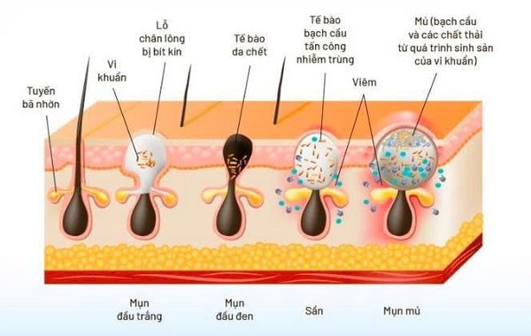 - mụn đầu đen, mụn đầu trắng hoặc mụn bọc